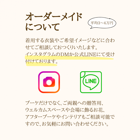 MUKUTOUでは造花のウェディングブーケをお好みやご希望にあわせてオーダーメイドでおつくりしてます。ご注文は公式LINEかインスタグラムのDMで承っております。