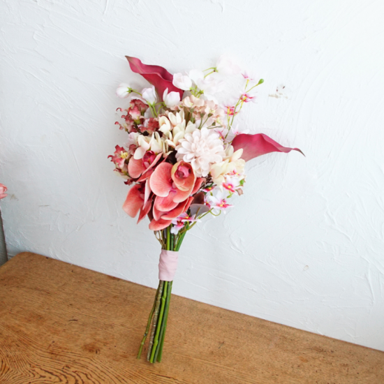 花嫁様のブーケとお揃いのお花や色味でお任せでおつくりしており、一律3,300円でおつくりしています。