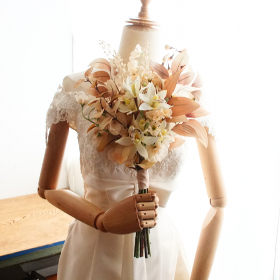 花嫁様のブーケとお揃いのお花や色味でお任せでおつくりしており、一律3,300円でおつくりしています。