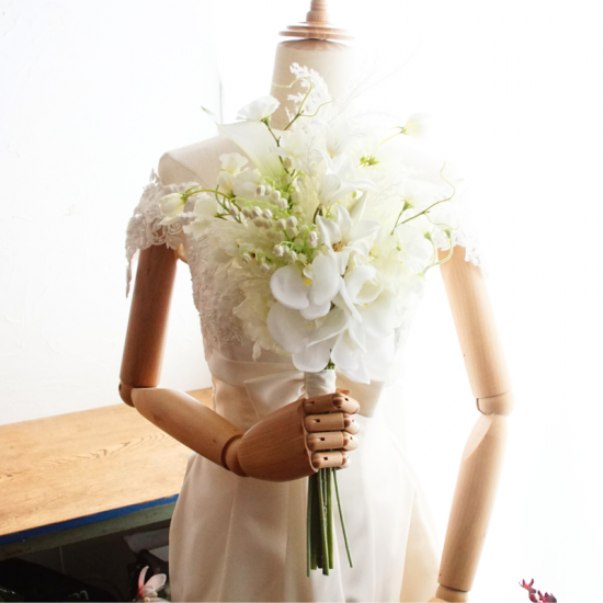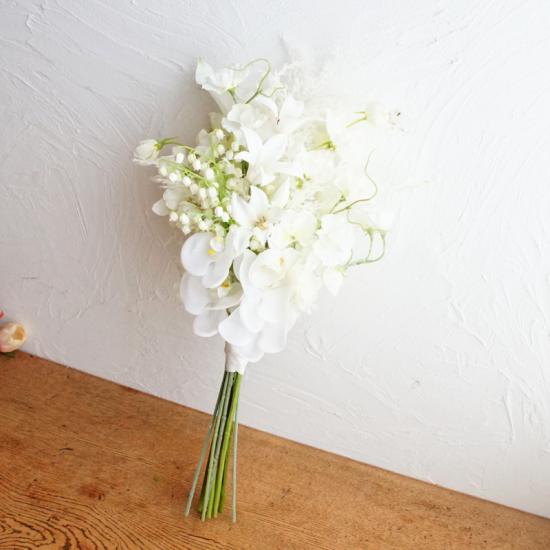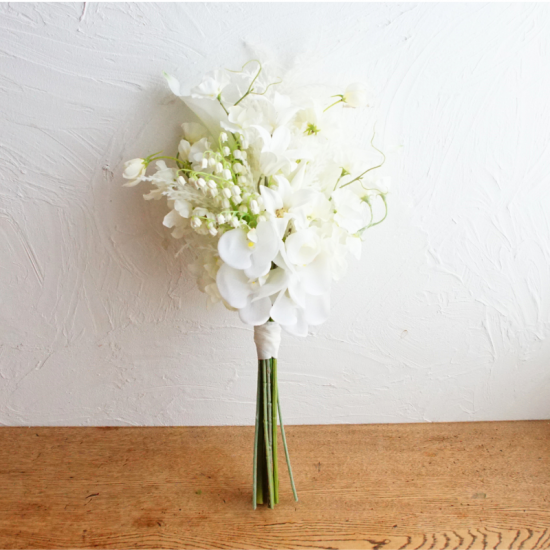 花嫁様のブーケとお揃いのお花や色味でお任せでおつくりしており、一律3,300円でおつくりしています。