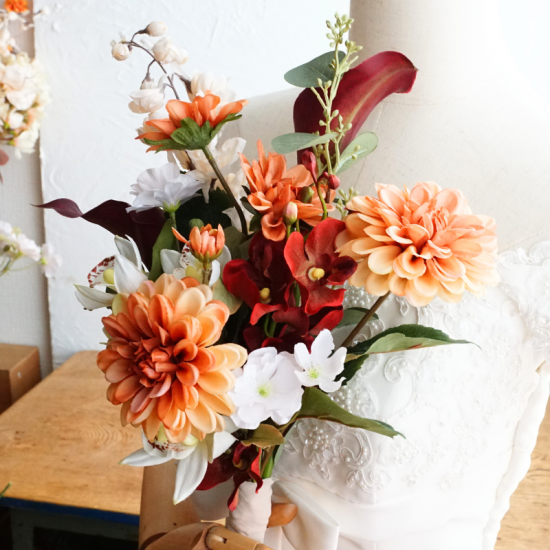 花嫁様のブーケとお揃いのお花や色味でお任せでおつくりしており、一律3,300円でおつくりしています。