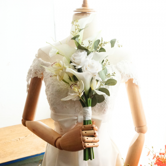 花嫁様のブーケとお揃いのお花や色味でお任せでおつくりしており、一律3,300円でおつくりしています。