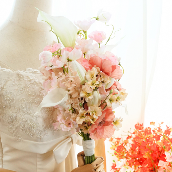 当店では、ブーケとお揃いのお花や色味でおつくりする「ブートニア」「ヘッドパーツ(10点セット)」のオプションをご用意しています。