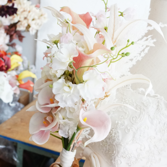 胡蝶蘭、パンパスグラス、デルフィニウム、ユーカリ、スイートピー、オンシジューム、カラーなど