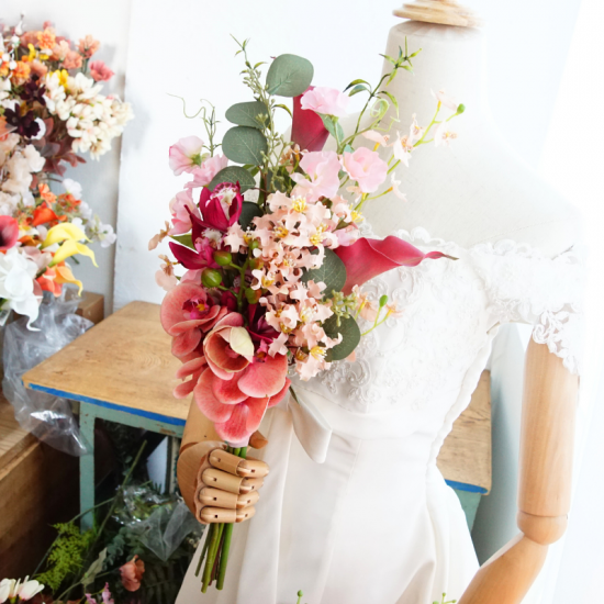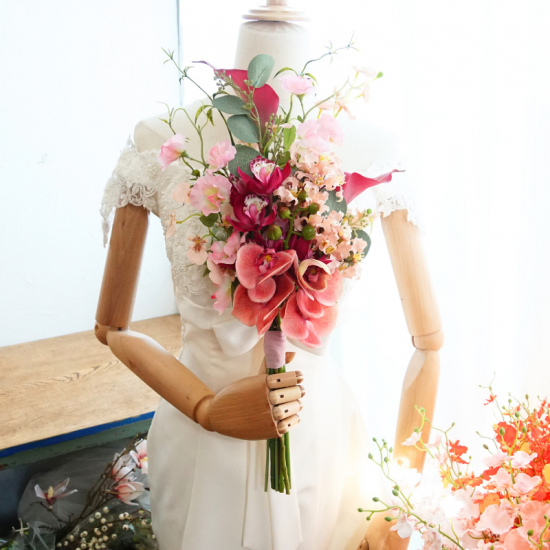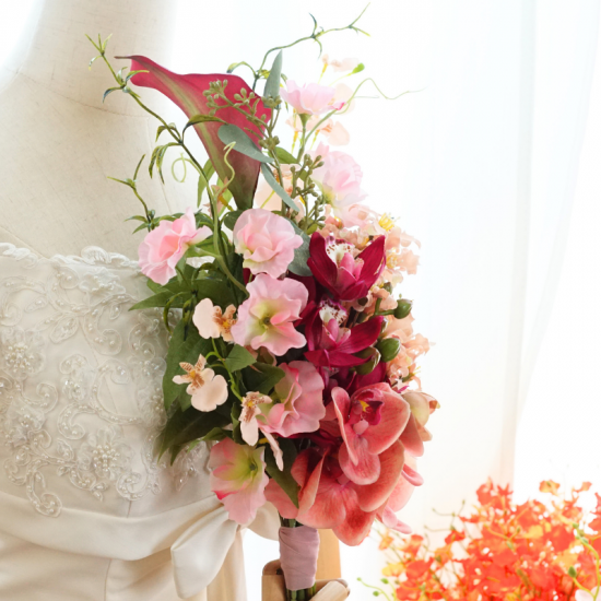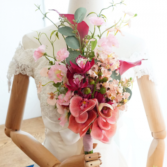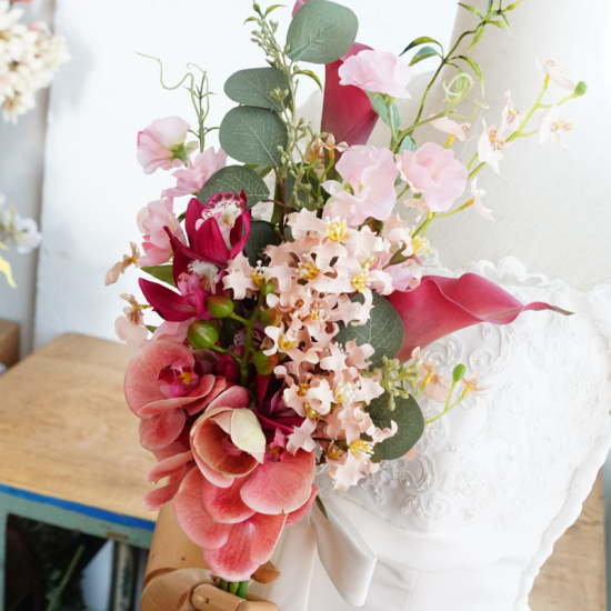 胡蝶蘭、ユーカリ、オンシジューム、スイートピー、カラー、シンビジュームなど