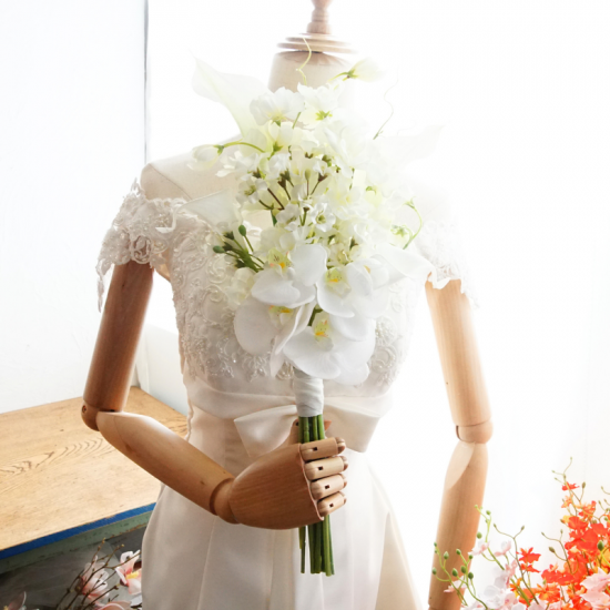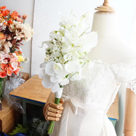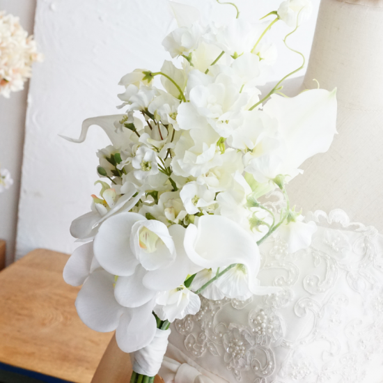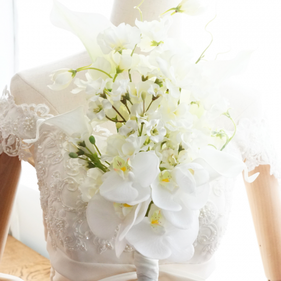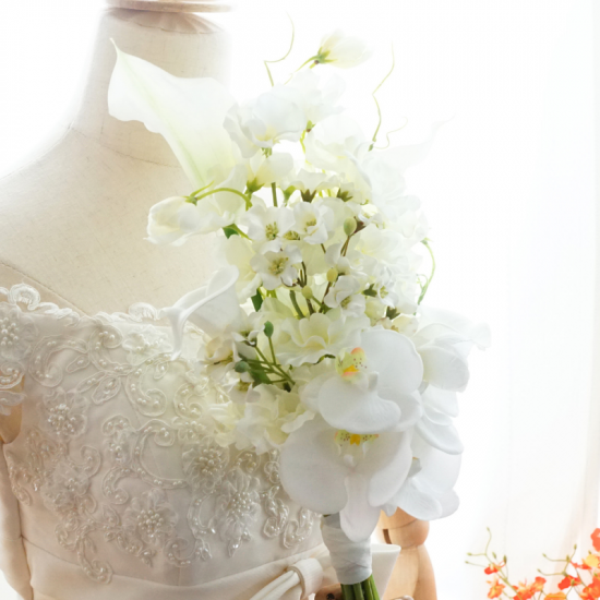 【レンタルブーケ&ブートニアセット】胡蝶蘭とカラーのブーケ(オレンジ×ブルー)