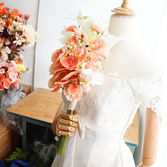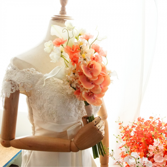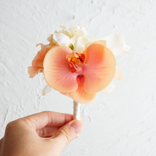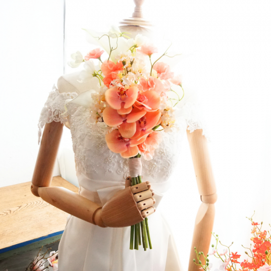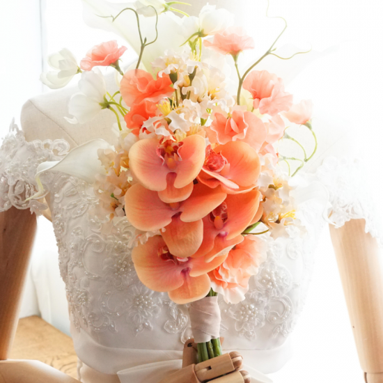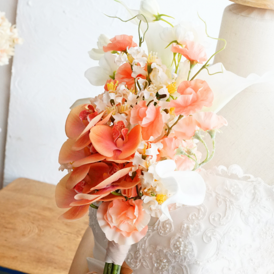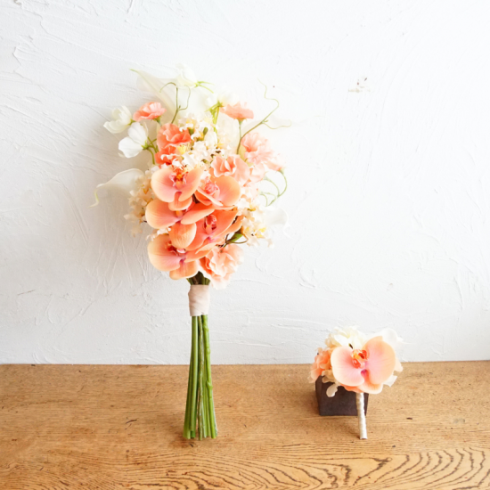 【レンタルブーケ&ブートニアセット】スイートピーと胡蝶蘭のブーケ(コーラル)