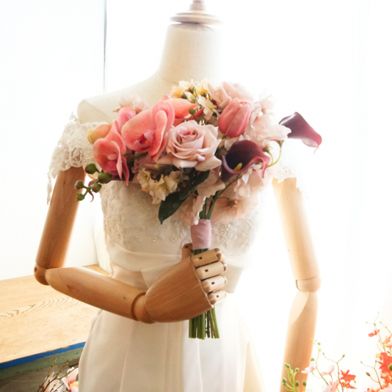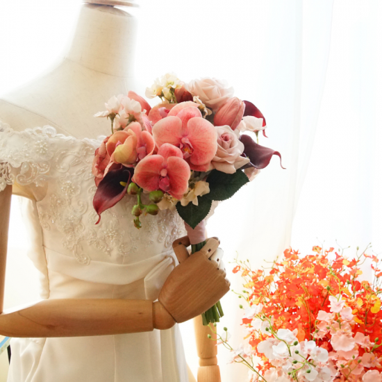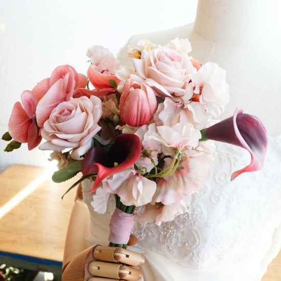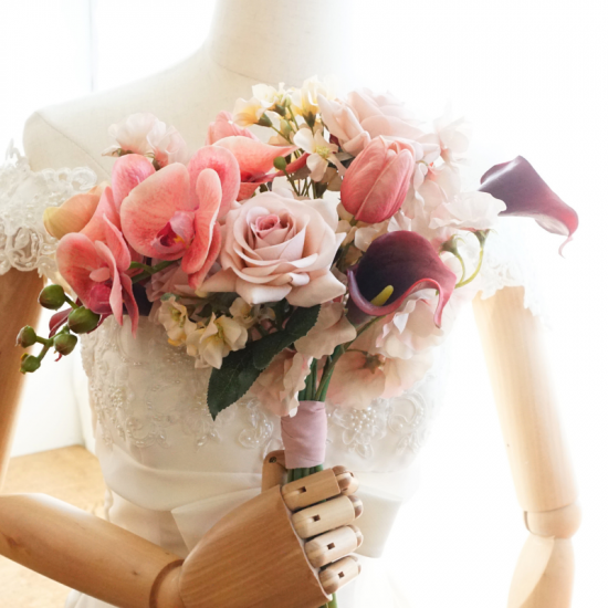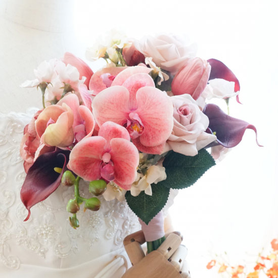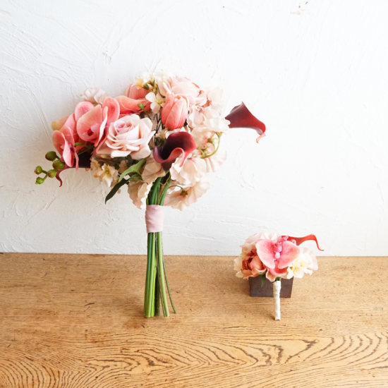【レンタルブーケ&ブートニアセット】バラと胡蝶蘭のブーケ(ピンク×ボルドー)